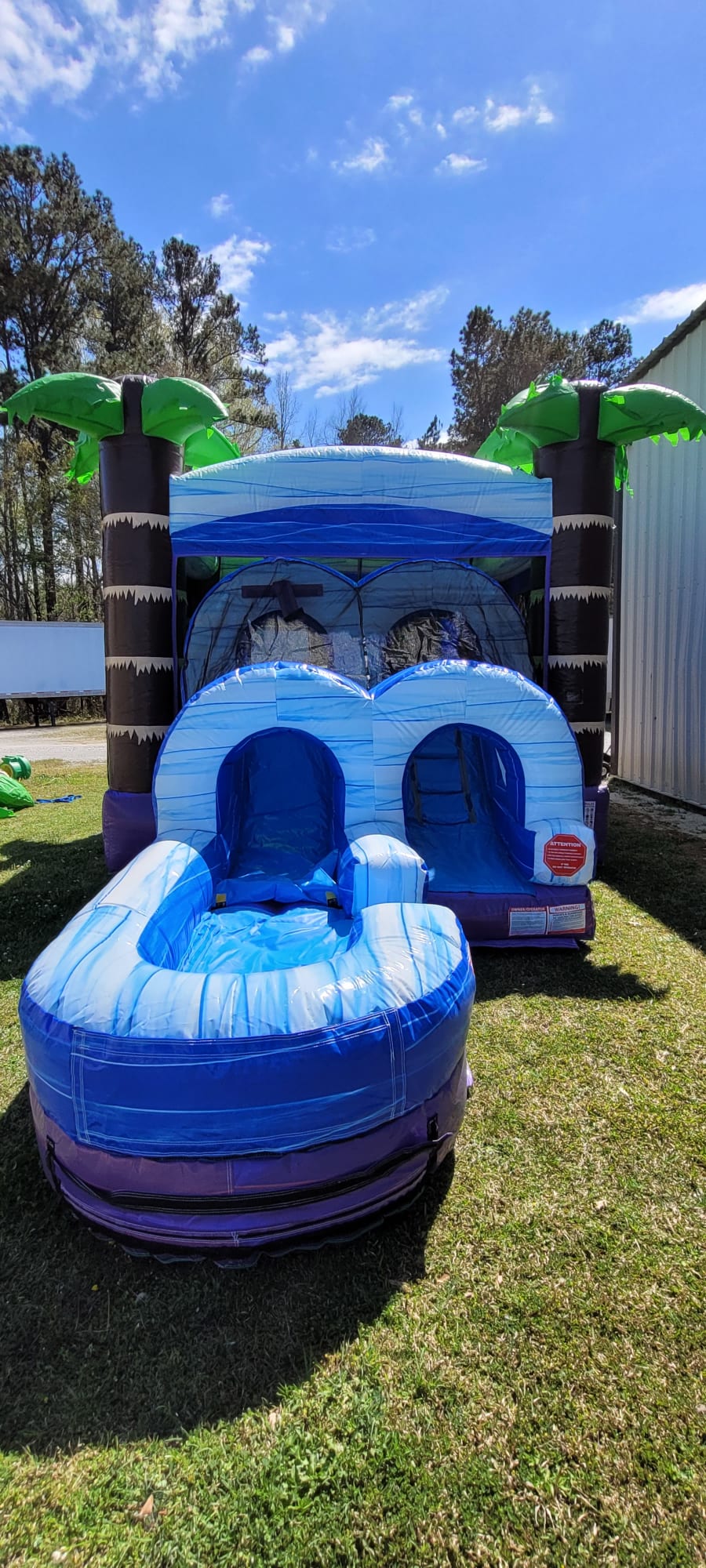 Let the kids take a trip to paradise with our Tropical Paradise Combo inflatable! They are sure to love jumping amongst the palm trees or shooting some hoop into the basketball goal, don't forget the fun they will have sliding down the water colored slide too!