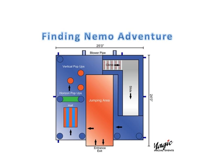 Search no more for the perfect inflatable for your next event.... The Finding Nemo Experience has everything you are looking for! This HUGE combo inflatable includes a bounce house, slide, obstacles, and more all in one! Let the fish friends from Finding Nemo bring some fun to your next party!