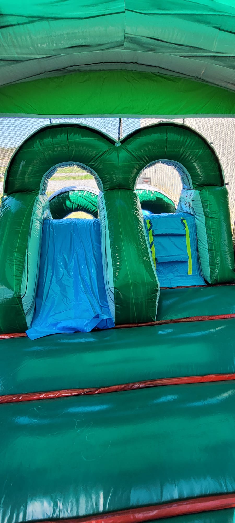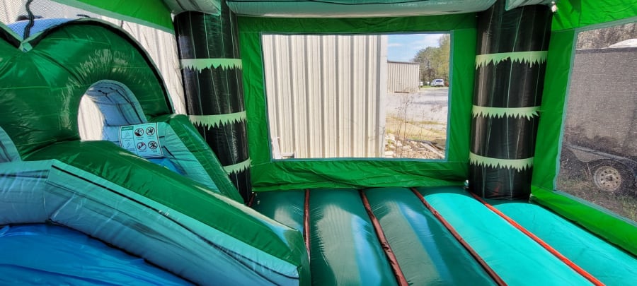 The kids will be feeling like they escaped to a tropical oasis is our fun and bright themed Tropical Isle Combo inflatable! This inflatable features a bounce house surrounded by palm trees, a basketball goal inside and a slide with vibrant water coloring to pair great with both your luau or dinosaur themed parties!