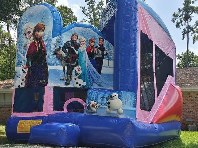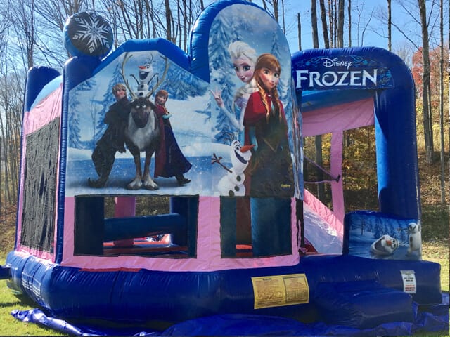 Hailing all the way from the land of Arendelle, join fearless Anna, Snow Queen Elsa, and their best of friends Kristoff, Sven, and Olaf in this elegant combo unit! The Frozen Combo includes a spacious jumping area, delightful waterslide, fun basketball hoop, and pop-up inflatable obstacles that even the Ice Queen herself would absolutely love!